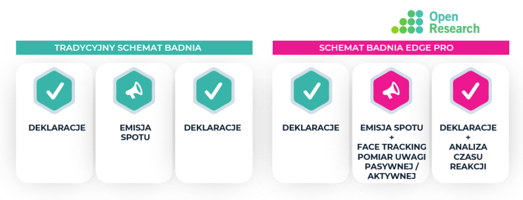 W badaniu EdgePro, podczas emisji spotu w czasie rzeczywistym, kamera skanuje mimikę odbiorcy. Następuje też wsparta algorytmem analiza zaangażowania widzów w prezentowany materiał klatka po klatce. Po emisji respondent odpowiada na szereg pytań na temat prezentowanego materiału.