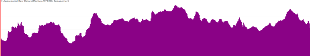 Często w naszej praktyce badawczej analizujemy reklamy, które szybko budują uwagę, ale po kilku pierwszy sekundach „gasną”. Zaangażowanie spada, by ponownie odbudować się w połowie spotu. Na powyższym wykresie widzimy przykład takiej reklamy, analizowanej w czasie rzeczywistym. Sceny pomiędzy piątą a dziesiątą sekundą uruchamiały pewne odczucia i emocje, które spowodowały spadek zaangażowania. Ich dokładna analiza (bez potrzeby wchodzenia w deklaracje konsumentów) pokazuje, co jest problemem badanej reklamy. Często jest to detal, sposób zachowania postaci, niezrozumiały dialog – elementy, które trudno wydobyć z odbiorców na poziomie deklaracji.